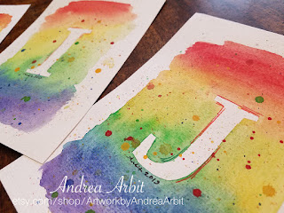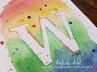 As promised, here are some close-up shots of my recently completed 26 5"x7" rainbow alphabet watercolor paintings. (You really need close-ups to best see the green and orange thin Sharpie line details I added!)